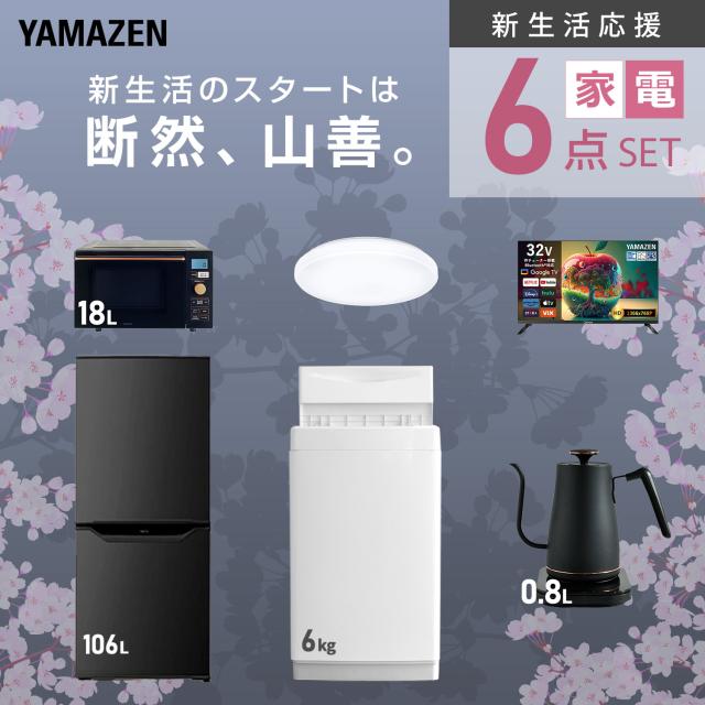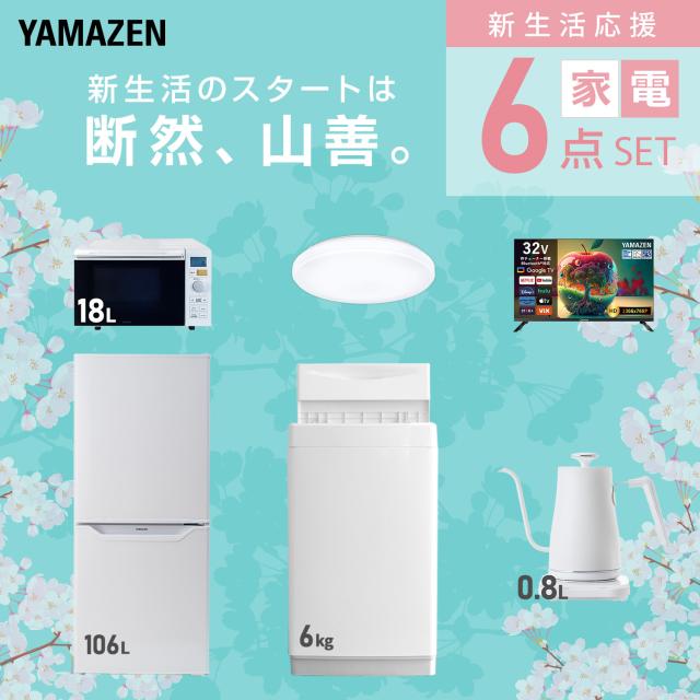 【新生活応援セット】 家電セット 一人暮らし 新生活家電 6点セット 新品 (6kg洗濯機 106L冷蔵庫 オーブンレンジ シーリングライト スマートテレビ 32型 温調ケトル) 一人暮らし 1人暮らし 単身 単身赴任 家電セット 新生活 大学入学 山善 YAMAZEN 【送料無料】