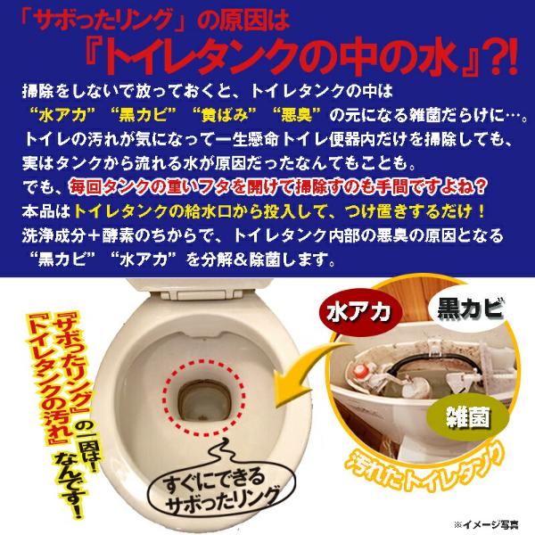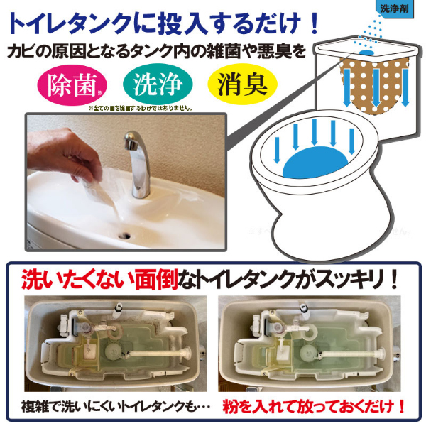 トイレタンクの給水口から投入して、つけ置きするだけ!洗浄成分+酵素のちからで、トイレタンク内部の悪臭の原因となる「黒カビ」「水アカ」を分解&除菌します。