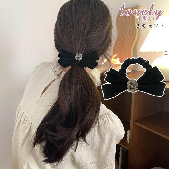 ヘアゴム シルク シュシュ 髪の毛を傷めない リボン 黒 ヘアアクセ 小さめ 可愛い 結婚式 カジュアル ヘアアクセサリー 2点セット 母の日
