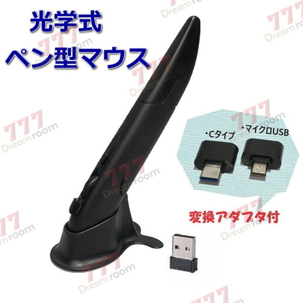 光学式 ペン型 マウス ブラック ワイヤレス 無線 2.4GHz パソコン PC スマホ タブレット タイプC マイクロUSB 変換ソケット付
