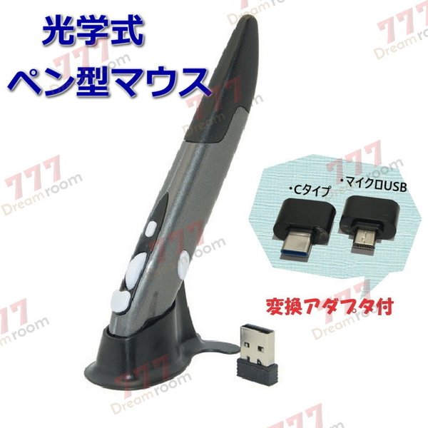 光学式 ペン型 マウス グレー ワイヤレス 無線 2.4GHz パソコン PC スマホ タブレット タイプC マイクロUSB 変換ソケット付