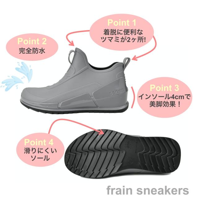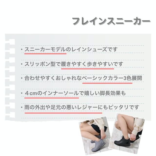 ・スニーカーモデルのレインシューズです ・スリッポン型で履きやすく歩きやすいです ・合わせやすくおしゃれなベーシックカラー3色展開 ・4cmのインナーソールで嬉しい脚長効果 ・雨の外出や足元の悪いレジャーにもピッタリです |