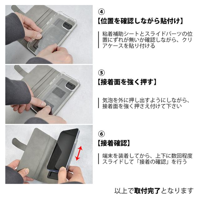 ※端末の素材や凹凸により接着が出来ない場合がありますので、ハードタイプのクリアケース(別売)と粘着補助シート(付属)を併用されることを推奨します。