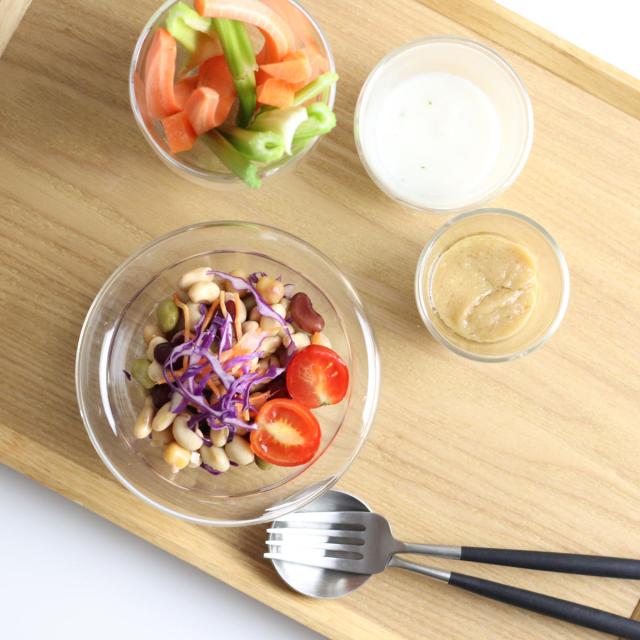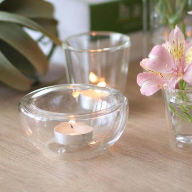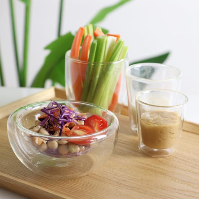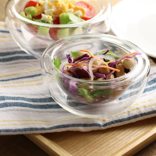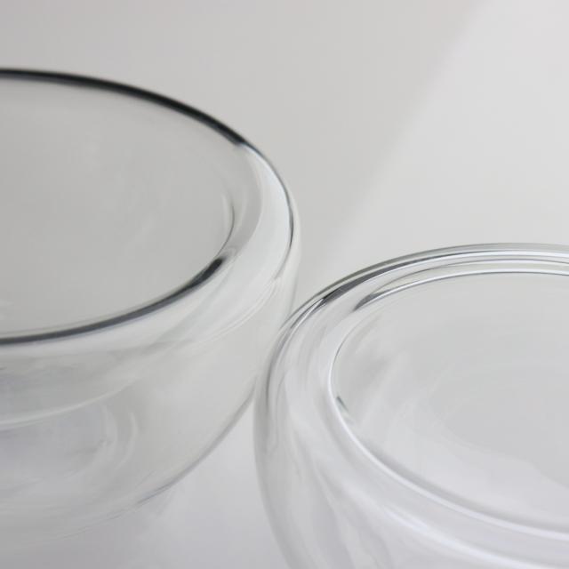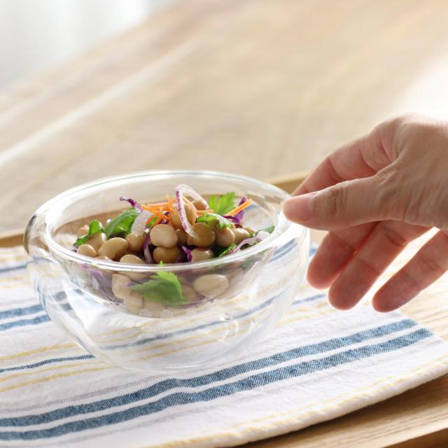 二重構造の耐熱ガラスを使用したボウルです。中にお料理を盛り付けると、宙に浮いたようなおしゃれな見た目が楽しめます。1人分のサラダやスープ、シリアルなどを入れるのにちょうどいいサイズ感です。