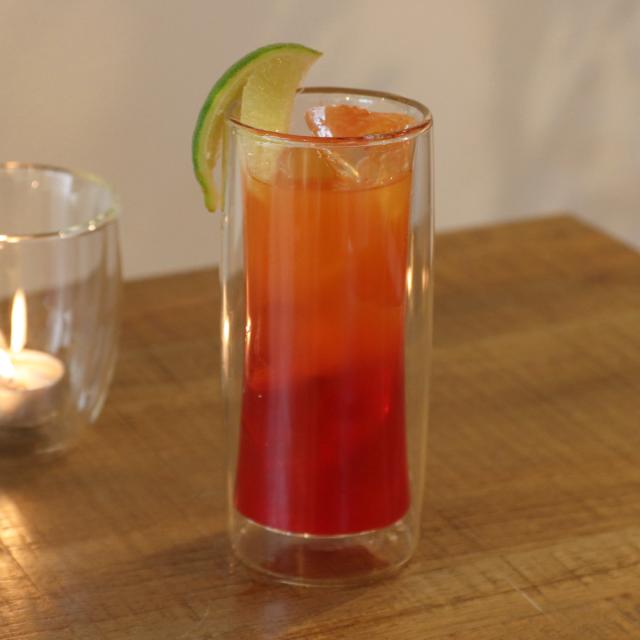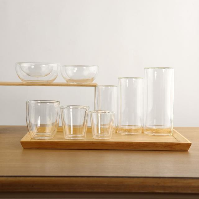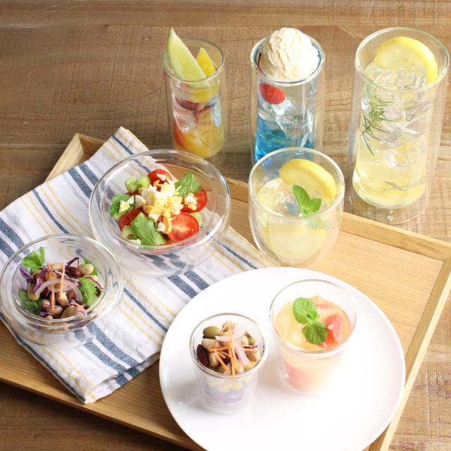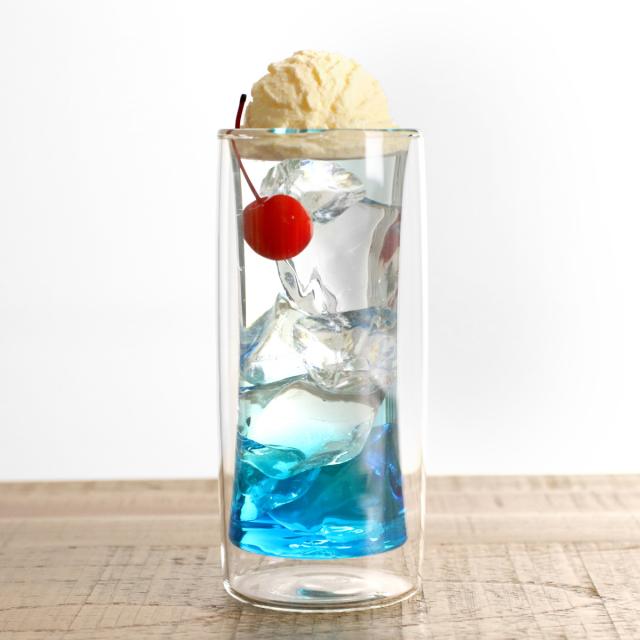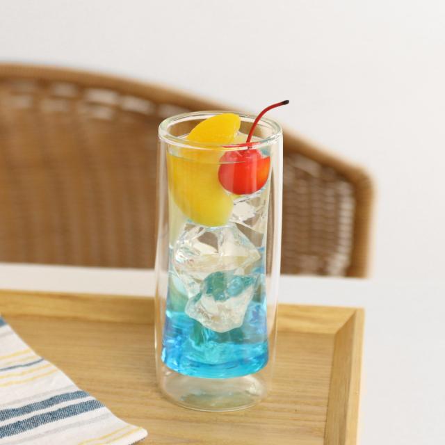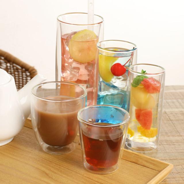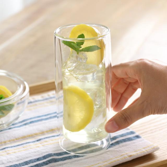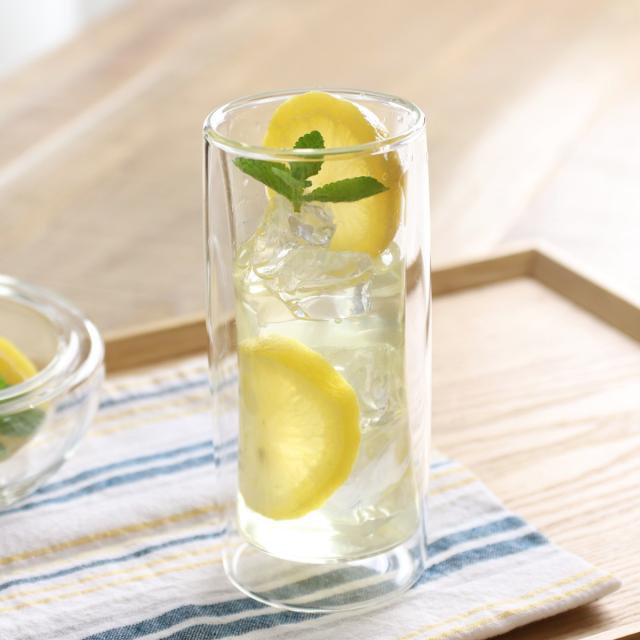 二重構造の耐熱ガラスを使用したタンブラーです。中にドリンクをいれると、宙に浮いたようなおしゃれな見た目が楽しめます。カクテルや、フレーバーウォーター、ソフトドリンクなどを入れるのにちょうどいいサイズ感です。