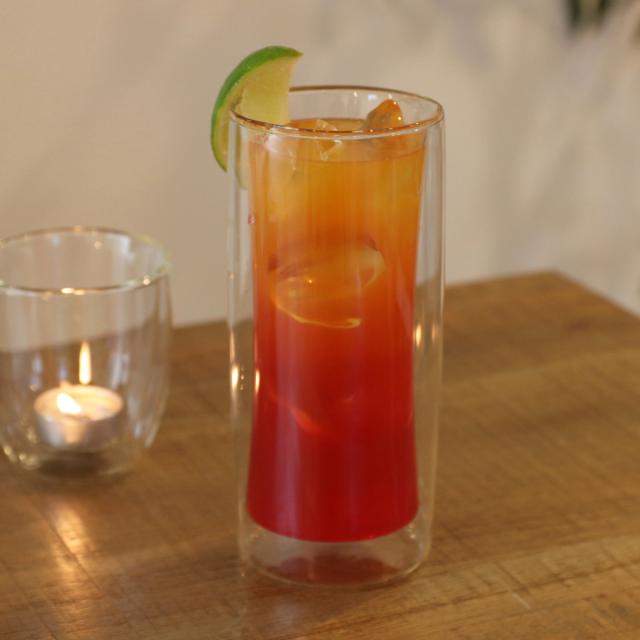 二重構造の耐熱ガラスを使用したタンブラーです。中にドリンクをいれると、宙に浮いたようなおしゃれな見た目が楽しめます。カクテルや、フレーバーウォーター、ソフトドリンクなどを入れるのにちょうどいいサイズ感です。