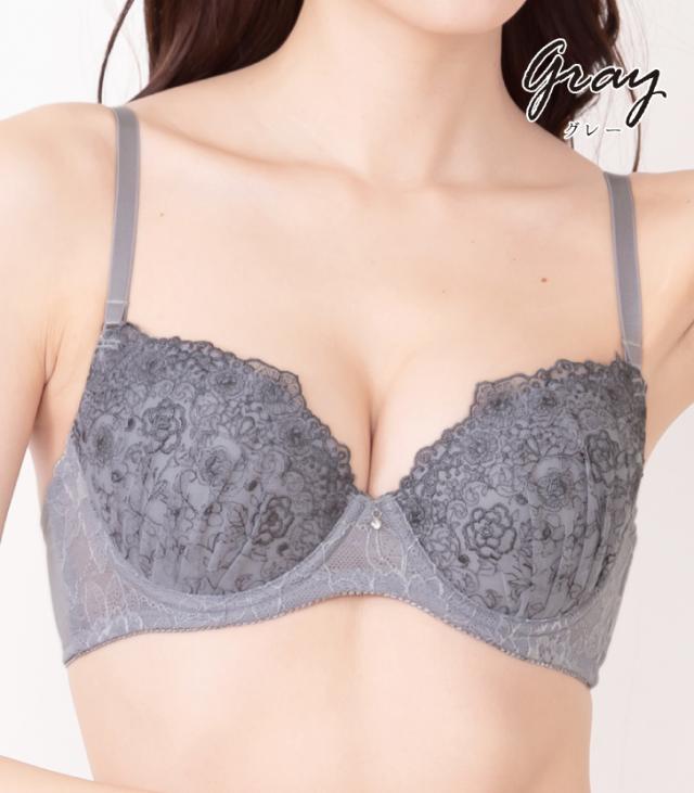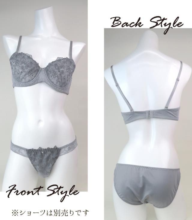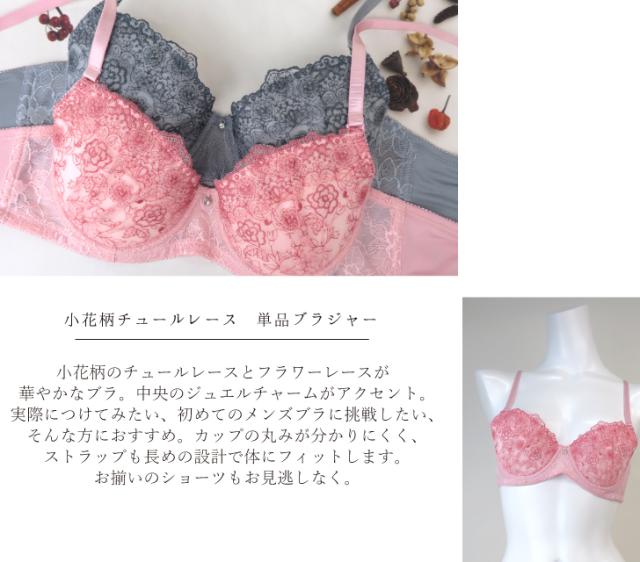小花柄のチュールレースとフラワーレースが華やかなブラ。中央のジュエルチャームがアクセント。実際につけてみたい、初めてのメンズブラに挑戦したい、そんな方におすすめ。カップの丸みが分かりにくく、ストラップも長めの設計で体にフィットします。お揃いのショーツもお見逃しなく。