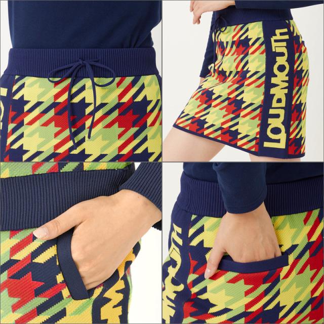 編みで表現された千鳥格子のデザインと「LOUDMOUTHロゴ」がポイントの軽量ニットスカート。