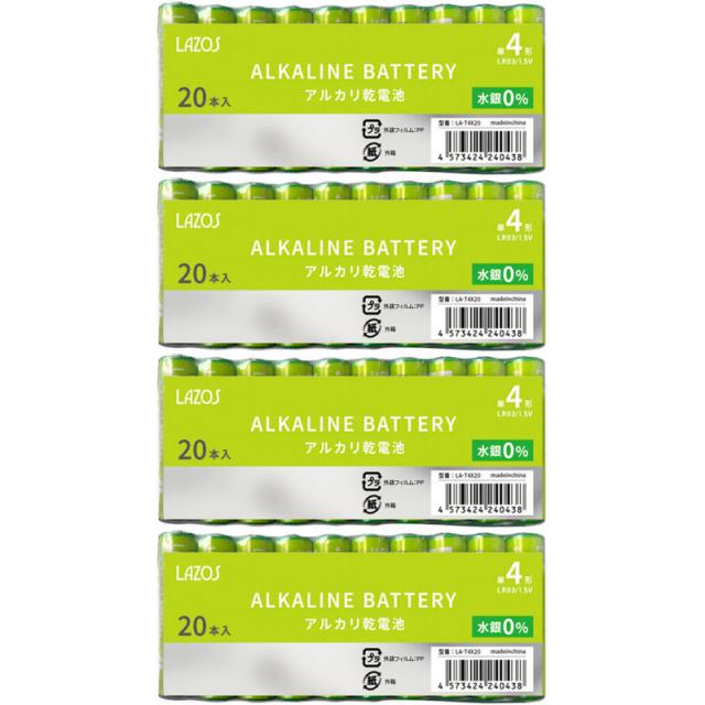 単4形 80本 アルカリ乾電池 LAZOS LA-T4X20 x4パック 単4 アルカリ 電池 乾電池