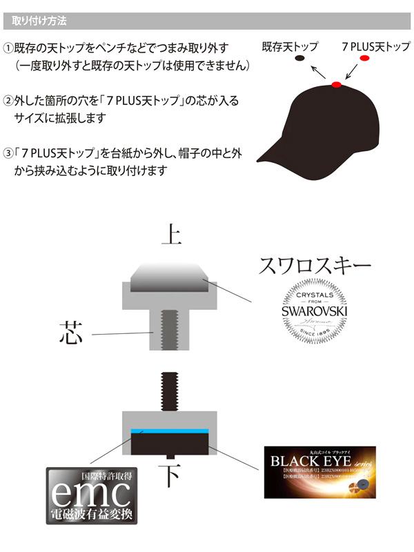 SEVEN PLUS TEN TOP セブンプラス 天トップ 【SEVEN PLUS(セブンプラス)】 世界初、日米特許を取得。 SEVEN PLUSは業界で唯一、電磁波に関する特許技術を日本とアメリカで取得しているブランドです。 科学的に効果が認められた技術を使用し、開発されたSEVEN PLUSの製品はあなたを電磁波から守ります。 SEVEN PLUSの特許技術を集約して開発された”メロウェイブ・テクノロジー”。 電磁波有益変換効果をもつ、独自開発EMC・BLACK EYEが組み込まれた天ボタンです。 スマホやパソコン画面から発せられる有害な電磁波を軽減します。 「電磁波有益変換(EMC)」国際特許取得 ・特許 第6033599号 ・特許 第5922264号 ・米国特許 第9531080号 「BLACK EYE」一般医療機器取得 ・一般医療機器届出番号 23B2X000100000001 【取付方法】取付可能厚さ:約4mm ?@既存の天ボタンをペンチなどで取り外してください。 (一度取り外した天ボタンは再利用できません。) ?A外した箇所の穴を本製品「天TOP」の芯が挿入できるまでサイズを拡張してください。 ?B本製品を台紙から外し、帽子の中と外から挟み込むように取り付けてください。 「期待できる効果・効能」 お客様から下記のような実感があったというお声を多数頂いております。 ●寝つきが良くなり、朝スッキリ目覚める日が増えた。 ●ずっしり重かった肩や体が軽くなった。 ●体が疲れにくくなった気がする。 ●パソコンやスマホの使用による目の疲れが軽減された。 ●パソコン使用時に感じていた手の違和感が軽減された。 ●長期的に続いた原因不明の体調不良が改善した。 ●肌荒れが軽減された。 ※効果には個人差があります。全ての方に効果を保証するものではありません。 | ||
