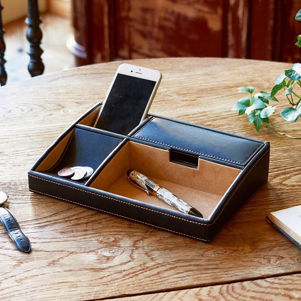 携帯電話、時計、メガネや鍵、コインなどを一手に収めておけます。