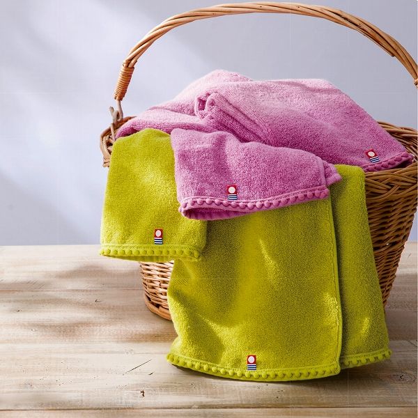 大人っぽいピスタチオカラーにかわいらしいポンポンを付けたタオルです。やわらかくて肌触りの良い無撚糸を使用しています。