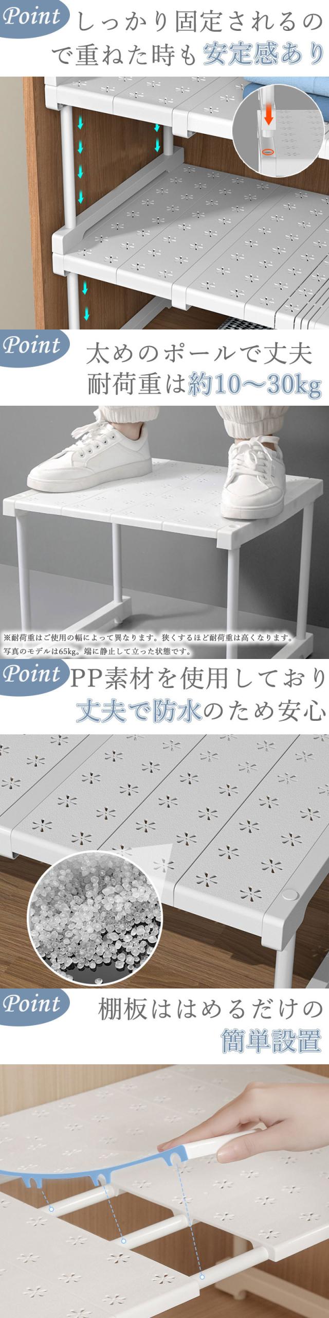 | 商品 特徴 | 【積み重ね可能】 お好きな高さに重ねてもお使いいただけるので、デッドスペースを解消しスペースを有効活用できます。 【伸縮可能】 お好きな幅に調整できるため、設置個所にピッタリのサイズにできて整理も快適に。 【多様性】 衣類の収納だけでなく、キッチンのシンク下でお鍋や調味料、玄関でシューズラックとしてなど、様々な用途でご使用いただけます。 【簡単組み立て】 工具不要で簡単に組み立てられます。 |