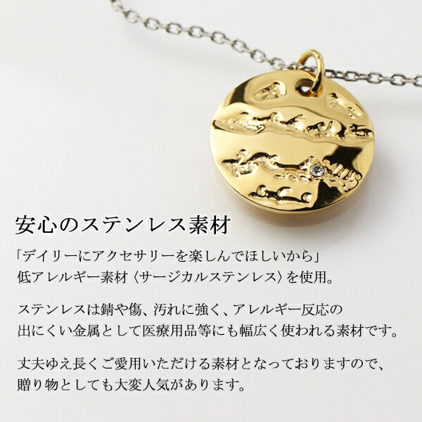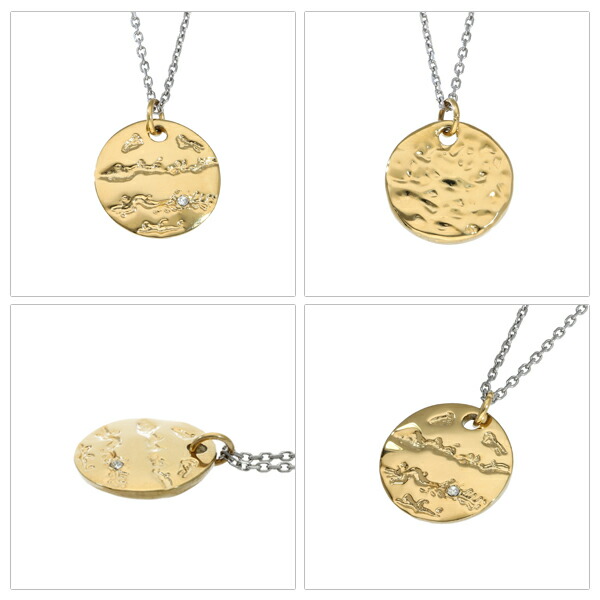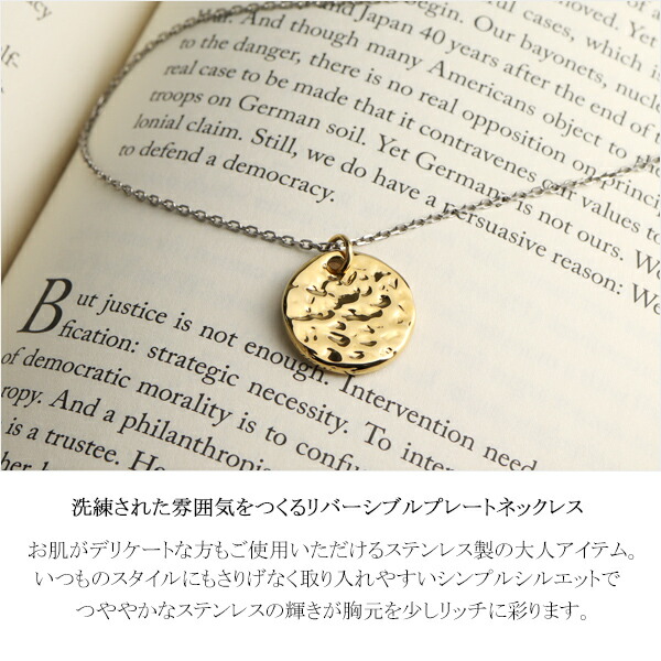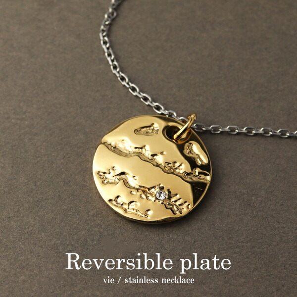 リバーシブル コイン ネックレス ゴールド サージカルステンレス 金属アレルギーフリー 一粒 ジルコニア 硬貨 丸 ラウンド 月 英字 英文 槌目