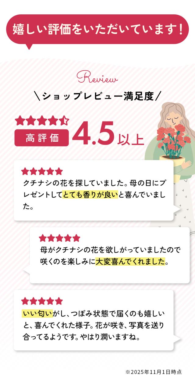 - 母親と姉妹々にクチナシを。 いい匂いがし、つぼみ状態で届くのも 嬉しいと、喜んでくれた様子。 花が咲き、写真を送り合ってるようです。 やはり潤いますね。 ありがとうございました!