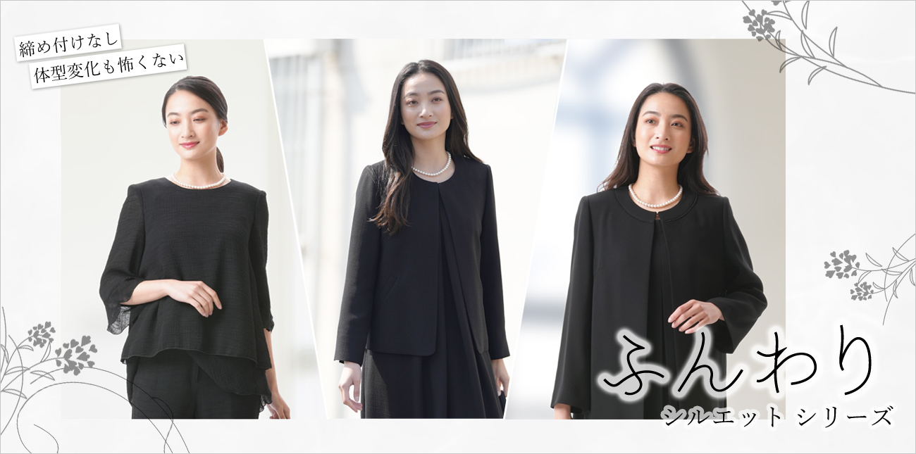 大人の女性に似合うシンプルなデザインで40代、50代、60代と幅広い年代の女性におすすめです。また、品質の差が出る“黒”は深みのあるスーパーブラックを使用しており高級感のある仕上がりです。葬儀、告別式、通夜などの弔事にてご着用いただけます。