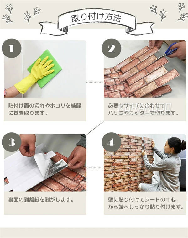 予め、事前に貼る場所をきれいに乾拭きし、ホコリや汚れを取り除いた状態で作業してください。