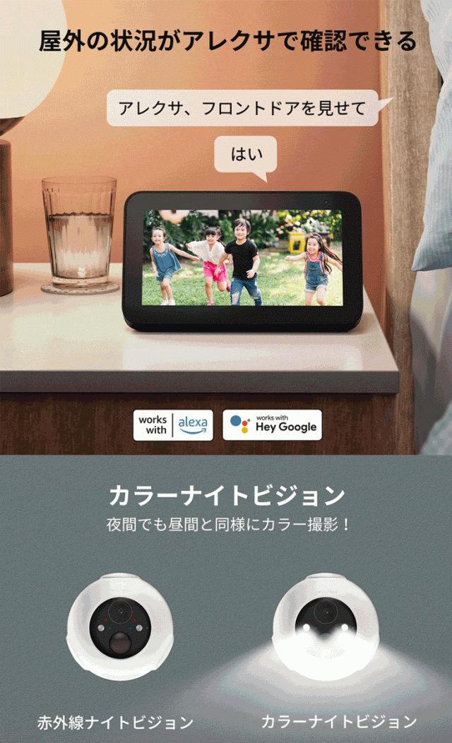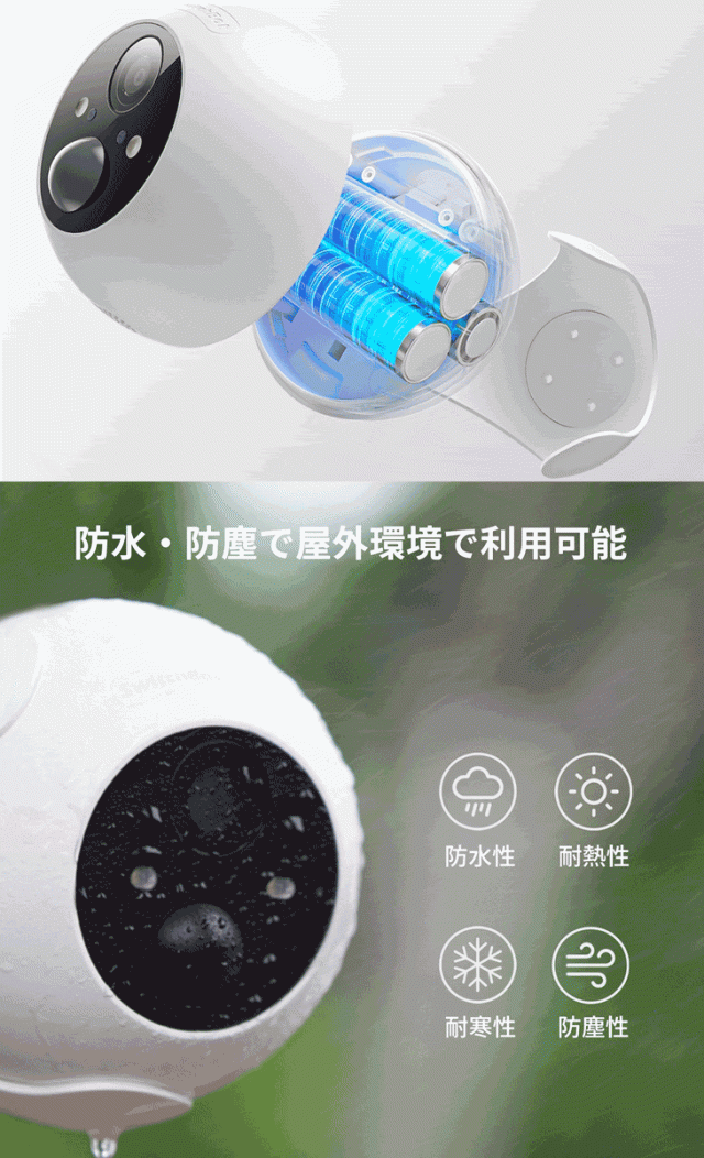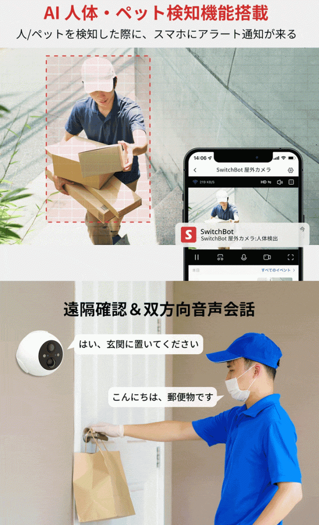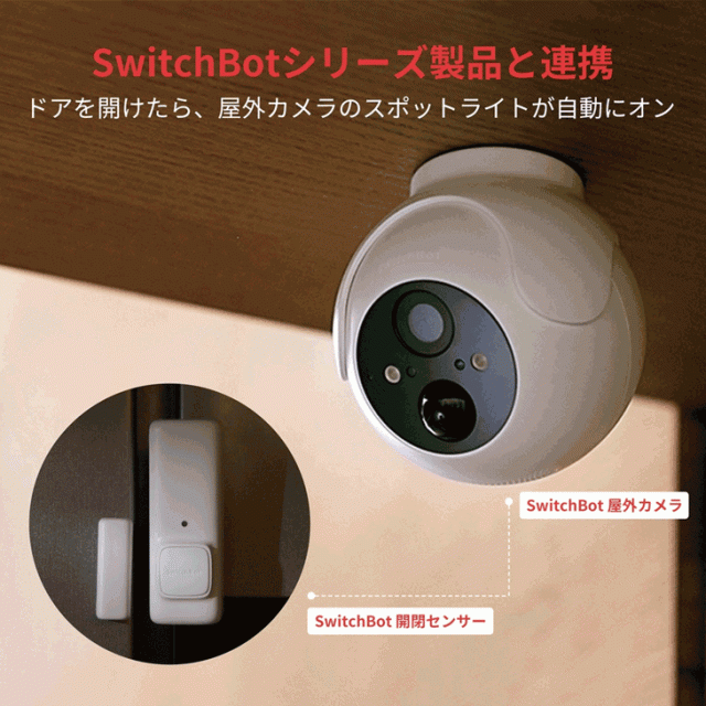 帰宅が遅くなる心配。旅行先で家の安全を悩む時間。SwitchBot屋外カメラが解決します。昼夜問わずリアルタイムの映像提供、人感技術で異常を検知し、すぐにスポットライトとサイレンで威嚇。もう安心、安全に暮らせます。