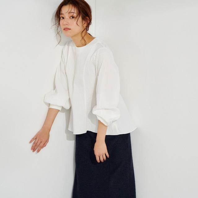 ハリのある素材で袖のフォルムや身頃の緩やかに広がるシルエットは可愛らしくなり過ぎない印象に仕上げ、軽やかにスタイリングしやすい1枚です。