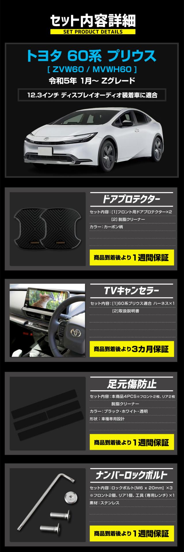 [対象商品10%OFFクーポン発行中]プリウス 60系 専用乗り出し4点セット[ドアプロテクター/足元傷防止/TVキャンセラー/ナンバーロックボルト]PRIUS カスタム パーツ ドレスアップ トヨタ TOYOTA[5]