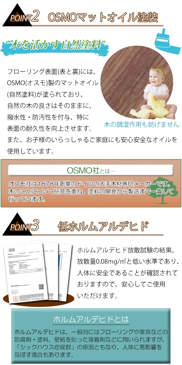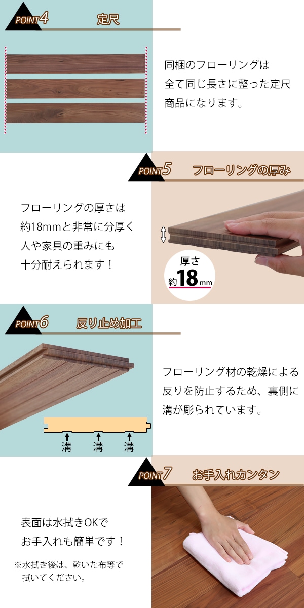 ●はめ込み式で簡単に設置できるフローリングです!床を変えれば、お部屋の雰囲気もガラリと変わります! ●フローリング材には北アメリカ産のアメリカンウォールナットを使っています。天然無垢材のため、吸放湿性に優れており、調湿作用によって、夏はサラッと、冬は温かく、空間を快適にする作用を持っています。 ●フローリング同士をつなぎ合わせるために「実矧ぎ(さねはぎ)」という加工が施されています。 ●フローリング表面には、OSMO(オスモ)製のマットオイル(自然塗料)が塗られており、自然の木の良さはそのままに、撥水性・防汚性を付与、特に表面の耐久性を向上させます。 ●ホルムアルデヒド放散試験の結果、放散量0.08mg/m3と低い水準であり、人体に安全であることが確認されており、安心してご使用いただけます。 ●フローリングの種類、グレード、セットを豊富に取り揃えておりますので、お部屋に合ったフローリングをお選びください! ※ご使用前に、必ず注意事項をご確認の上、十分理解して商品をご使用下さい。 ■サイズ:約W910×D125×18(mm)[1枚あたり] ■重量:約1.2kg[1枚あたり] ■材質:無垢アメリカンウォールナット(北アメリカ産) ■品質グレード:Aグレード(色の違いや節、穴などが見当たらず、ほぼ文句なしの状態) ■塗装:OSMO(オスモ)製マットオイル ■梱包数量:5箱(80枚)[京間5畳分][面積約9.12平米] ●新品商品ではありますが、輸入商品の為、多少の擦り傷などがある場合がございますので、ご納得の上ご購入下さいませ。 ●ご購入後、お客様ご都合によるご返品、ご返金等は一切お受け致しておりません。 ●本商品を使用した際に発生したトラブル、事故につきまして、当社は一切の責任を負いません。ご使用に関しましては、全て自己責任にてお願い致します。 |