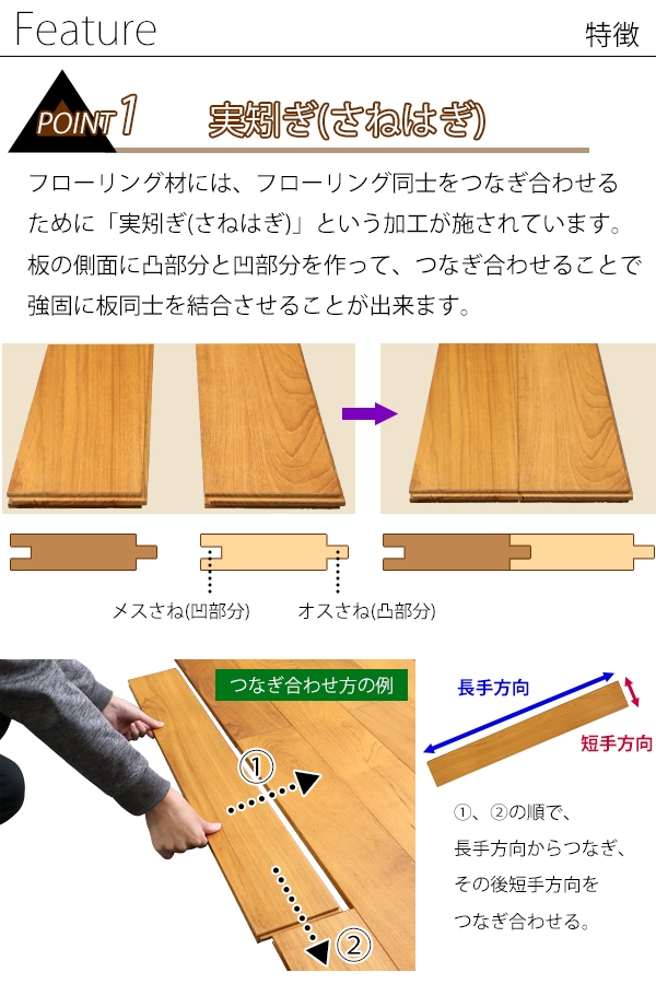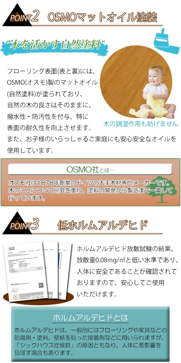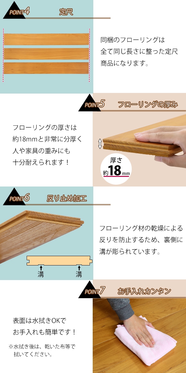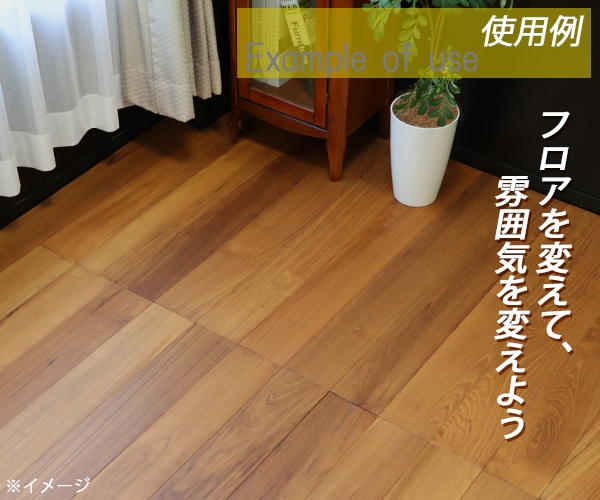 ●はめ込み式で簡単に設置できるフローリングです!床を変えれば、お部屋の雰囲気もガラリと変わります! ●フローリング材にはミャンマー産のビルマチークを使っています。天然無垢材のため、吸放湿性に優れており、調湿作用によって、夏はサラッと、冬は温かく、空間を快適にする作用を持っています。 ●フローリング同士をつなぎ合わせるために「実矧ぎ(さねはぎ)」という加工が施されています。 ●フローリング表面には、OSMO(オスモ)製のマットオイル(自然塗料)が塗られており、自然の木の良さはそのままに、撥水性・防汚性を付与、特に表面の耐久性を向上させます。 ●ホルムアルデヒド放散試験の結果、放散量0.08mg/m3と低い水準であり、人体に安全であることが確認されており、安心してご使用いただけます。 ●厚みのあるフローリングですが、床暖房にも対応しています。 ●フローリングの種類、グレード、セットを豊富に取り揃えておりますので、お部屋に合ったフローリングをお選びください! ※ご使用前に、必ず注意事項をご確認の上、十分理解して商品をご使用下さい。 ■サイズ:約W910×D120×18(mm)[1枚あたり] ■重量:約1.15kg[1枚あたり] ■材質:無垢ビルマチーク(ミャンマー産) ■品質グレード:Aグレード(色の違いや節、穴などが見当たらず、ほぼ文句なしの状態) ■塗装:OSMO(オスモ)製マットオイル ■梱包数量:8箱(128枚)[約8畳分][面積約13.98平米] |