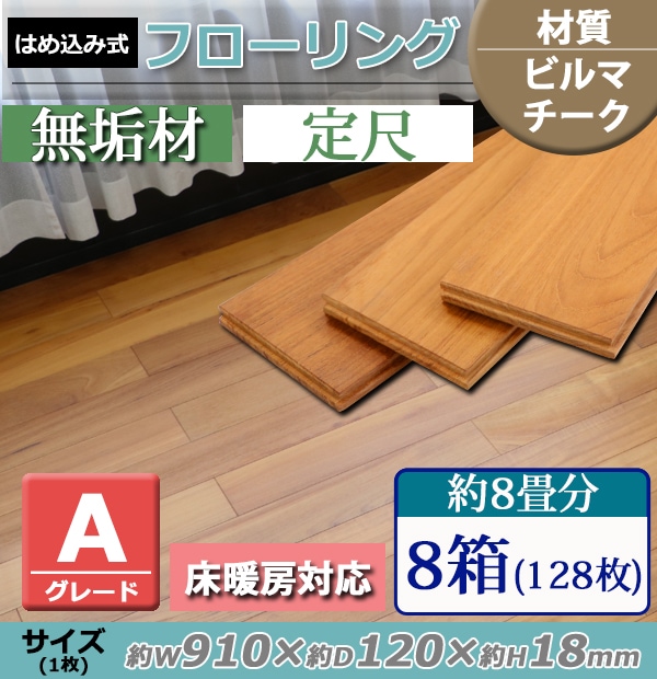 フローリング 床材 ビルマチーク 無垢 Aグレード 定尺 はめ込み 8箱 約8畳分 約13.98平米 128枚 約W910×D120×H18mm 床暖房対応 OSMOオイル 実矧ぎ フロアタイル 低ホルムアルデヒド 木目 床材 無垢材 天然木 貼り替え 張替え 補修 リフォーム diy floorsteaka8p