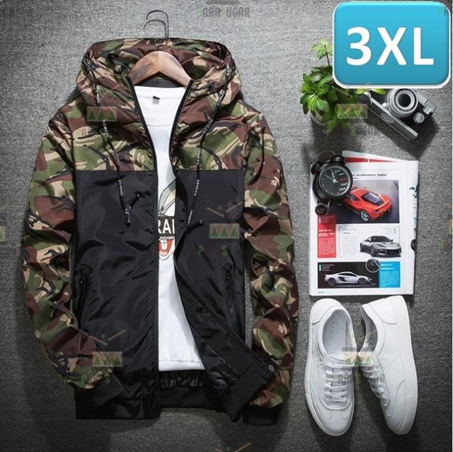 【174】 迷彩 ウィンドブレーカー フード付き グリーン 3XL メンズ ナイロン カモフラ 柄 アウトドア 防風 軽量 ジャケット