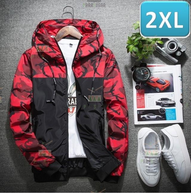 【174】 迷彩 ウィンドブレーカー フード付き レッド 2XL メンズ ナイロン カモフラ 柄 アウトドア 防風 軽量 ジャケット