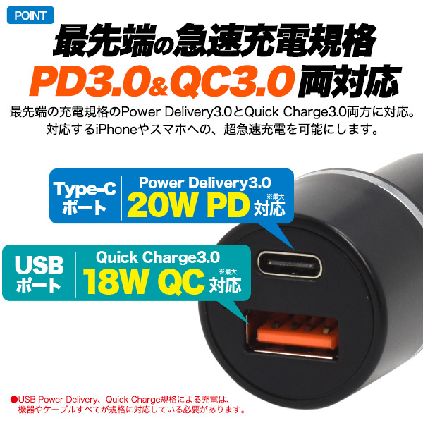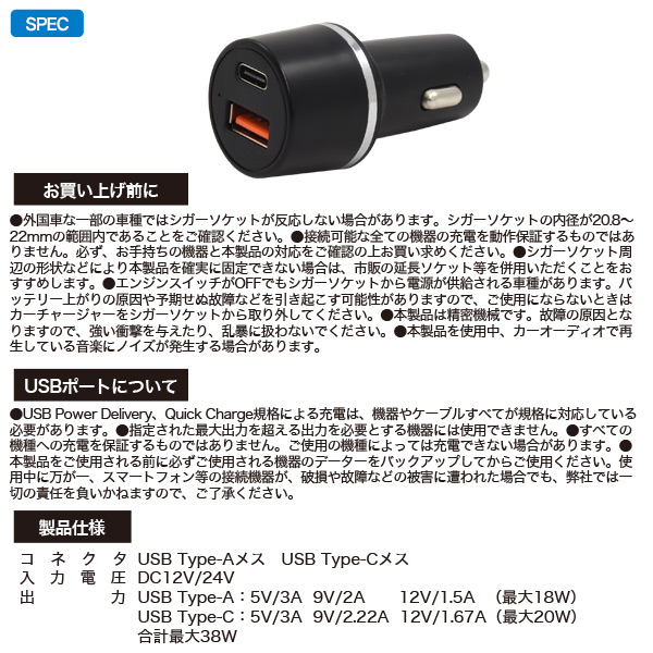 【品番】sg001 USB PDとQC両対応!合計最大出力38Wカーチャージャー。 12V/24V入力に対応で普通車はもちろん、トラックなどの大型車でも使用可能です。 ■配送方法■メール便で発送します。ご注文前に必ず「メール便注意事項」のページをご確認下さい。 ■メール便注意事項 【関連キーワード】ケータイ充電グッズ 車で充電 長時間外出も安心 災害時 防災 車中泊 ドライバー 車内に長時間いる方におススメ 車旅 卒業旅行 旅行グッズ 防災グッズ 防災用品 備え 必ずご確認下さい製品仕様の「お買い上げ前に」、「USBポートについて」の注意事項をなどをご確認のうえ、お買い求め頂きますようお願い申し上げます。 製品仕様【サイズ(約)】横63×直径27mm 【重量(約)】20g レビュー商品の評価: お店の情報定休日(土日・祝日)前日の午前11時以降のご注文は休業日明けの受付対応です。 お店の評価: 連絡・応対 - 配送スピード - 梱包 - 注目の特集 | ||||||||||||||||||||||||||||||||