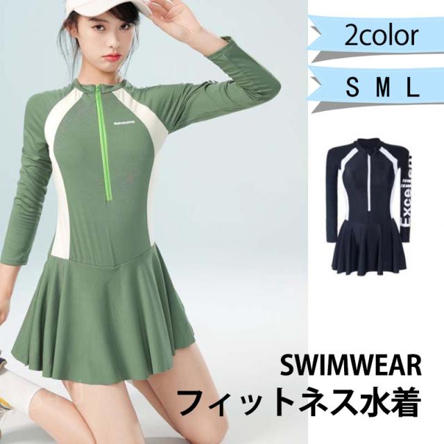水着 長袖 ワンピース水着 体型カバー 運動風 一体式 競泳水着 レディース Aライン 春 夏 無地 細見せ 大きいサイズ パッド付き フィットネス水着 露出控えめ スポーツ風 女性 盛れる おしゃれ 学生 韓国風 練習用 快適 速乾 海 プール 温泉