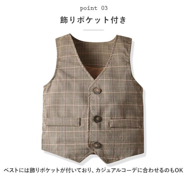 | 商品説明 | ・大切な記念日をスタイリッシュに決める♪男の子用のフォーマルセットが新登場。 ・ベスト、半袖ワイシャツ、パンツ&蝶ネクタイの、すぐに着られる4点セット! ・肌触り滑らかな綿生地を使用し、オールシーズン快適に着られるのもポイント☆ ・ベストには飾りポケットが付いており、カジュアルコーデに合わせるのもOK。 ・パンツのウエストは総ゴム仕立てなので、お子さまでも楽に履くことが可能。また両サイドにスリットポケット、お尻の部分にもポケット付き。 ・お揃いの生地でできた蝶ネクタイは簡単に取り外せるので、シーンに合わせて着こなしてみて♪ ・セットアップで着るのはもちろん、それぞれ単体で使ってもオシャレ。 ・発表会や結婚式などのフォーマルシーンもこれひとつでばっちり!お孫さんへのプレゼントにも。 |