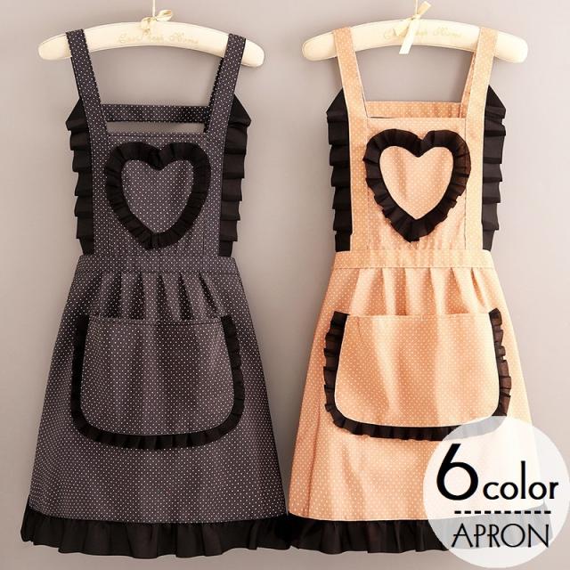 カフェエプロン レディース 女性 前掛け キッチン雑貨 日用品 台所用品 フリル ギャザー ハート ポケット付き ドット 水玉模