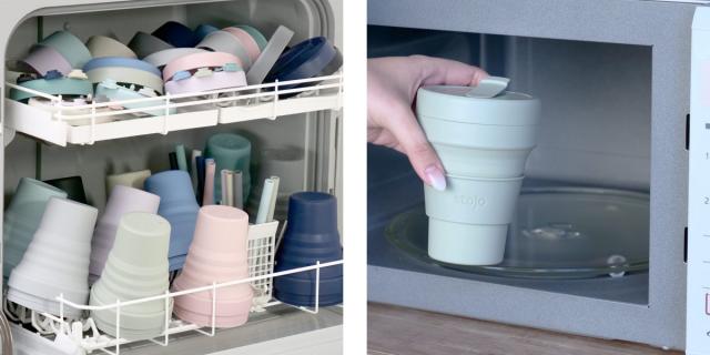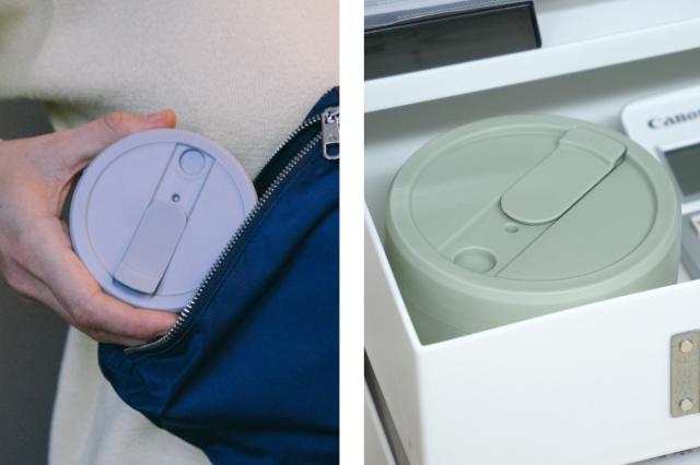 | お手入れ簡単で清潔に使える 蓋、スリーブ、ストッパーはそれぞれ取り外して隅々まで丸洗いができます。食器洗浄機も対応しているので、いつも清潔に使用できます。 | 電子レンジで温め直しもOK シリコーンカップのみ電子レンジに対応しています。飲み物が冷めてしまっても電子レンジで温め直せます。※電子レンジをご使用の際は、蓋を外して温めていただきますようお願いします。 |