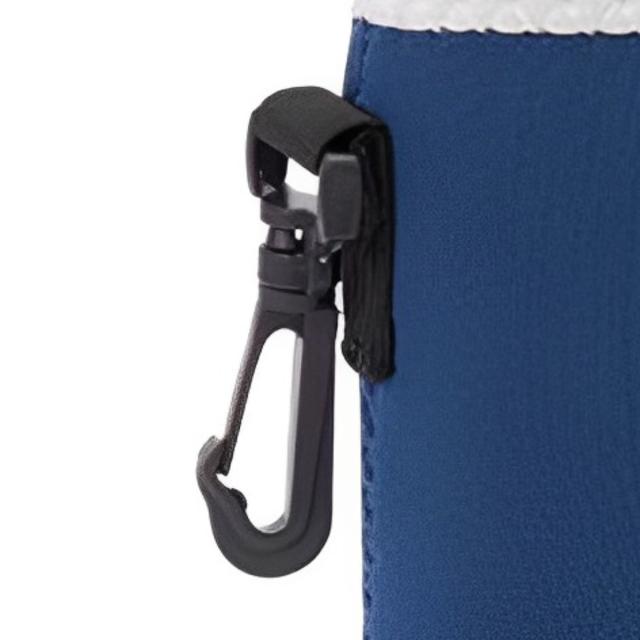 ボトルカバー側面にはカラビナが付いています。カバンに掛けて持ち運べるので、荷物に入らない時や、両手が塞がっている時でも持ち運べます。また、ショルダーストラップを付ければ肩や首から下げられて、飲みたい時にいつでも飲めるので便利です。