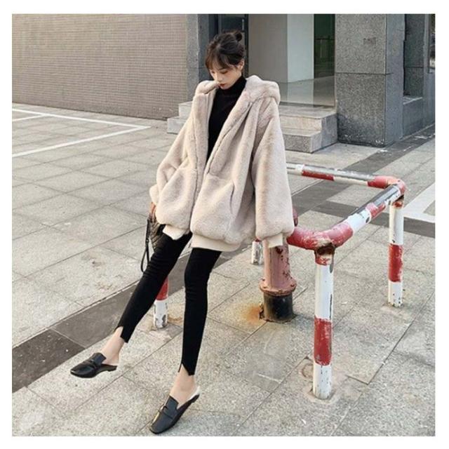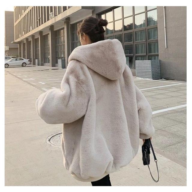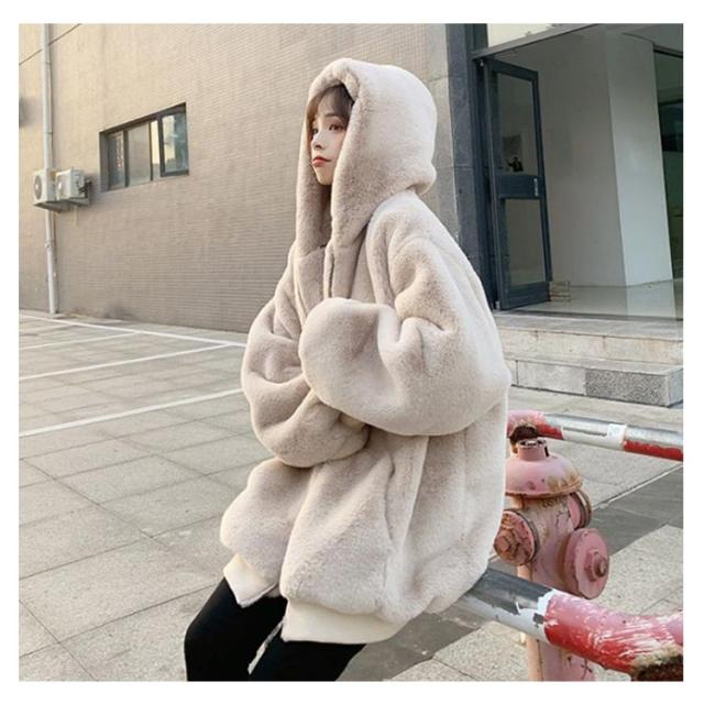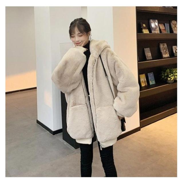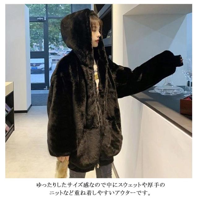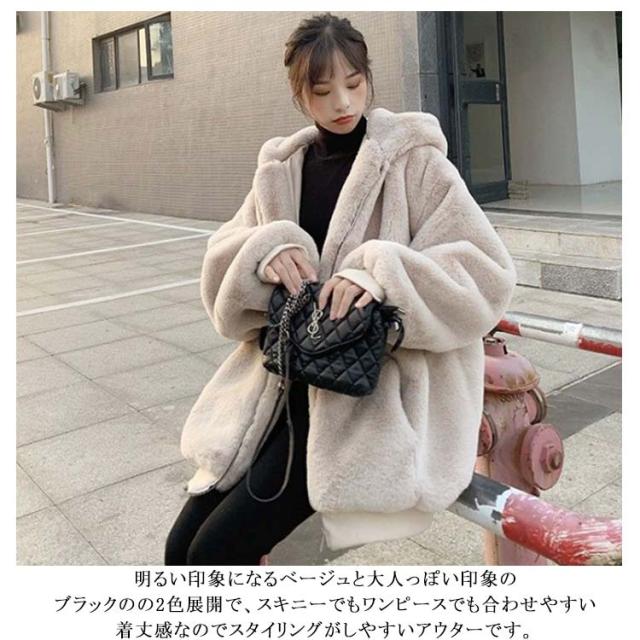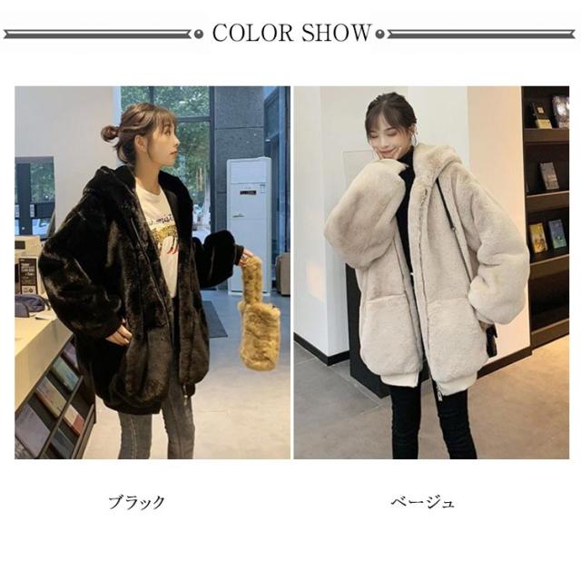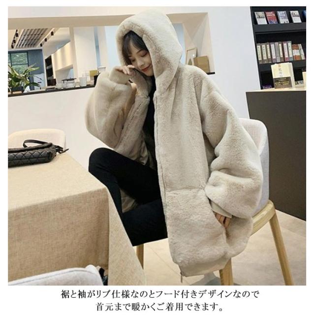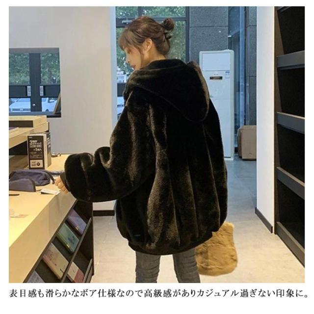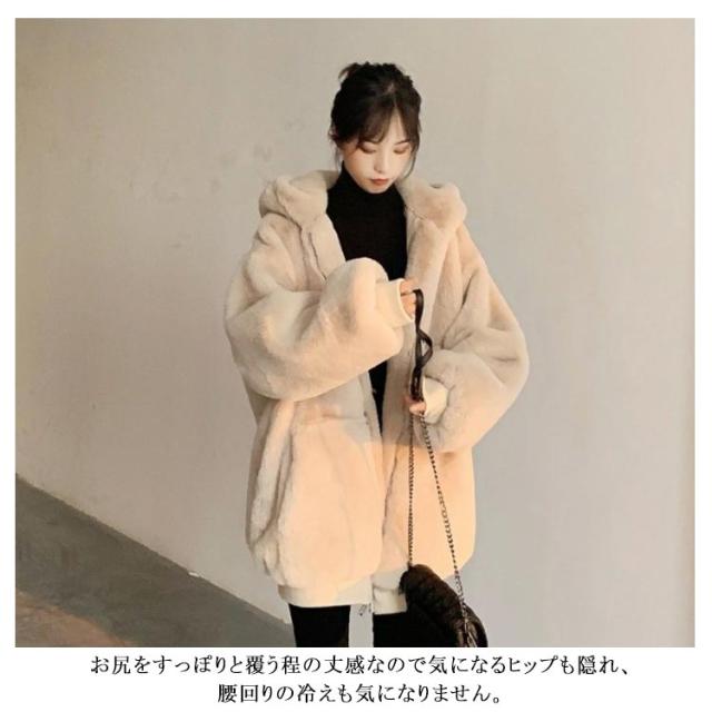 ボアブルゾン ファーコート レディース 女性 ボアジャケット エコファー ジップアップ 長袖 前開き フード付き ポケット付き ミドル丈 体型カバー 厚手 防寒 暖かい 無地 全2色