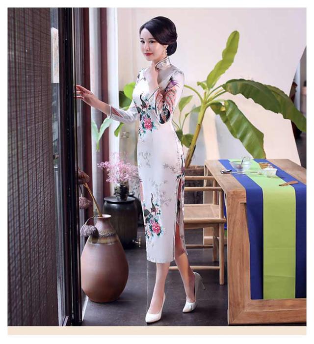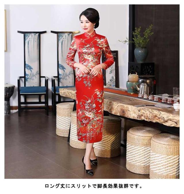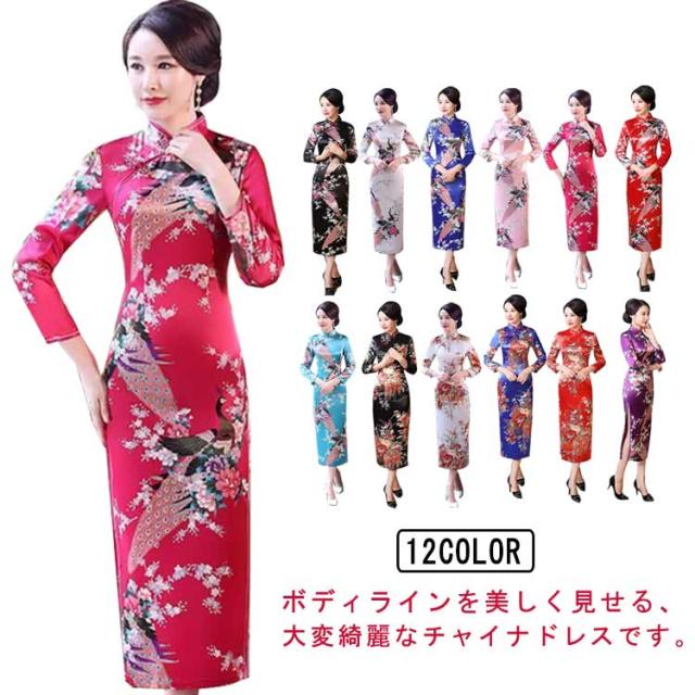 サイドスリット チャイナドレス ミモレ丈 ロング丈 ワンピース 優雅 セクシー 七分袖チャイナドレス パーティードレス エレガント レトロ 花柄 二次会 パーティー お呼ばれ 演奏会 発表会 披露宴 同窓会 S M L XL 2XL 3XL 4XL 5XL 6XL