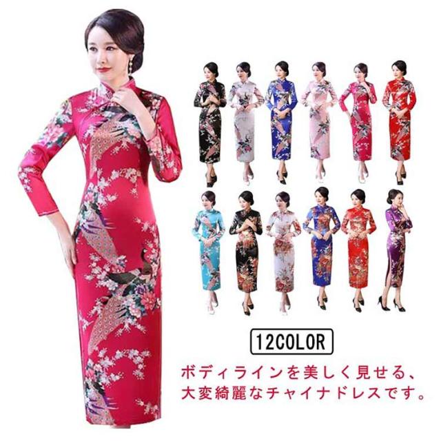 | ボディラインを美しく見せる、 大変綺麗なチャイナドレスです。 ロング丈にスリットで脚長効果抜群です。 孔雀&花柄の美しいデザインです。 | |