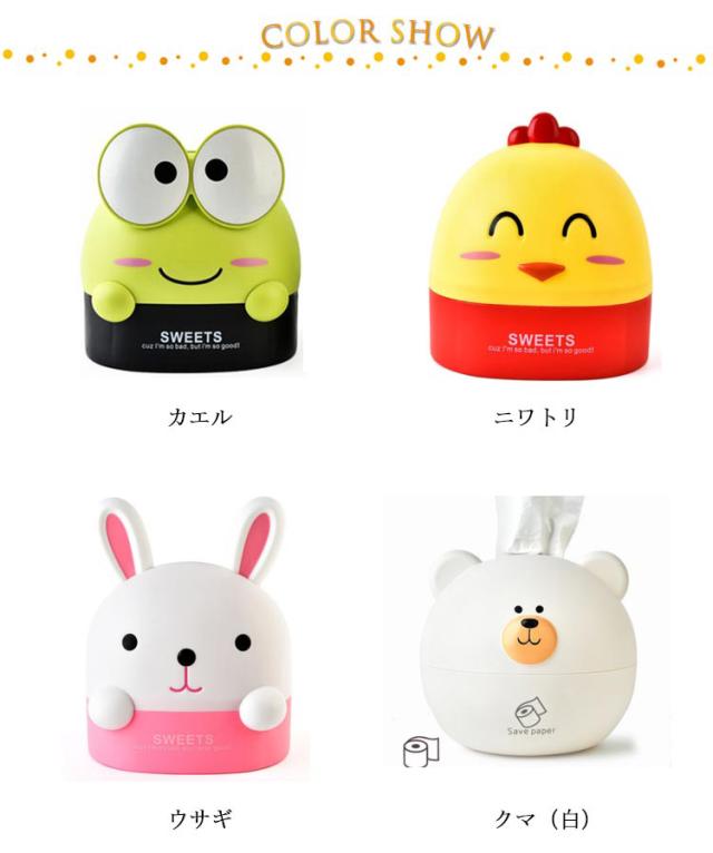| かわいいアニマル型のペーパーポット。【カエル型、クマ型、ブタ型、ニワトリ型、ネズミ型】 ペーパーポットはロールペーパーとティッシュペーパーの両方に対応しています。 フタをあけて中に入れ込むだけだから使用もとっても簡単です。 ロールペーパー・ティッシュペーパーなど水にぬれると後片付けが大変ですが、樹脂製なので、水回りの場所にもご使用いただけます。 ティッシュケースと思えない形で生活感を消すことが出来ます。形もカラーも豊富でインテリアにあった色のコロンとしたティッシュケースをぜひ、お楽しみください。 可愛いアニマルが毎日の日常に華やかさを演出してくれますよ? | |