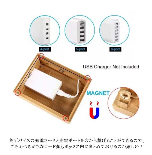 充電スタンド マグネット式充電ステーション スマホ充電スタンド ケーブル収納ボックス 竹製 スマートウォッチ/タブレット/AirPod/同時収納&充電可能 竹素材 モバイルバッテリーは付属なし