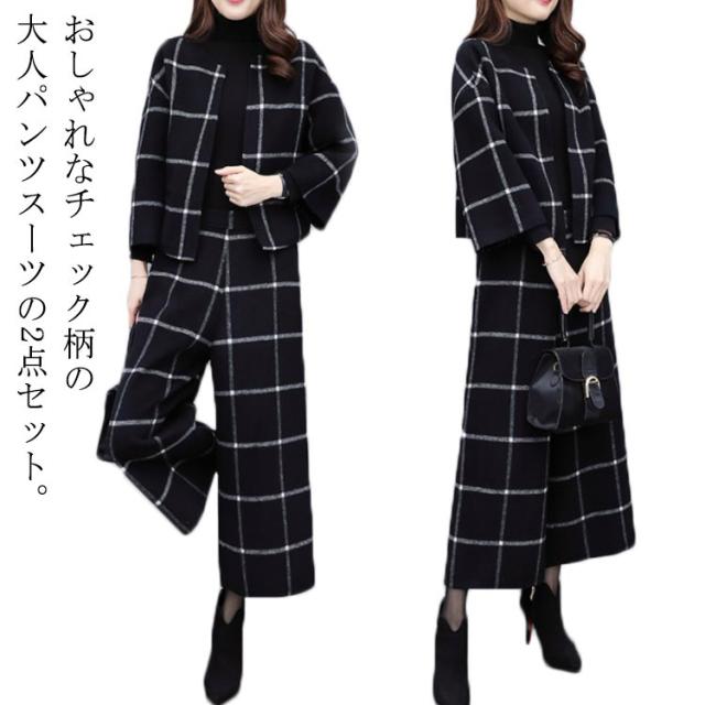 パンツスーツ セットアップ レディース ワイドパンツ パンツドレス 2点セット 入学式 スーツ ママ パンツ スーツ ノーカラージャケット ワイドスリーブ ビジネス オフィス 入学式 卒業式 入園式 卒園式 チェック柄 グレンチェック 大人 きれいめ 春 秋 冬