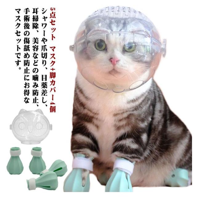 5点セット マスク+脚カバー4個 猫用 口輪 猫用マスク キャットマズル ネコ 爪切り補助用 通気 透明 猫用マズル クリア 猫用マスク ペットマスク ネコ ねこ 猫 噛み付き防止 拾い食い防止 傷舐め防止 耳掃除 シャワー 美容 ペットエリザベスカラー