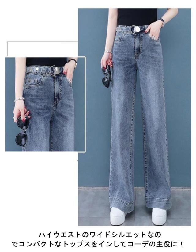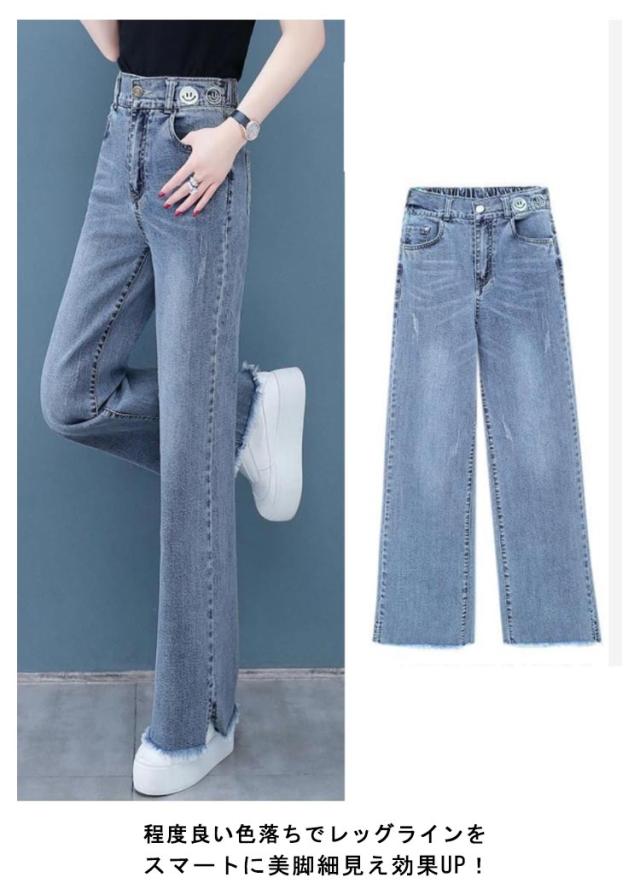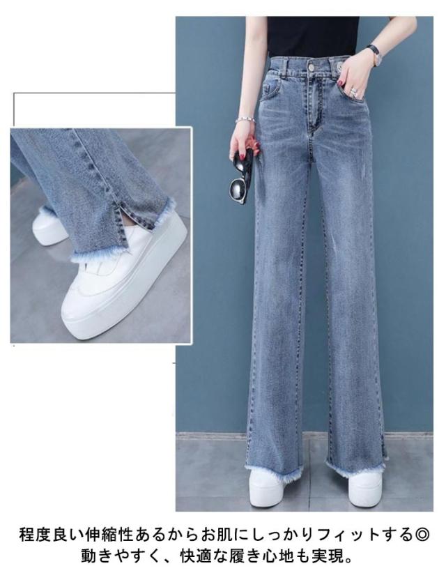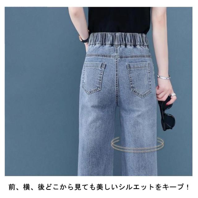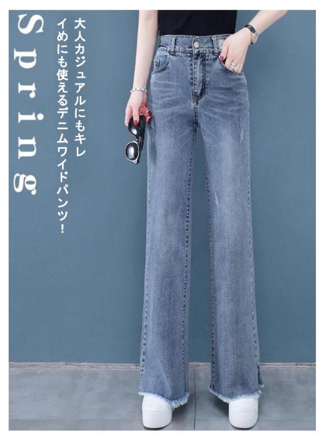 バックゴム デニムワイドパンツ ロング丈 デニムパンツ ワイド デニム ガウチョパンツ ジーンズ ハイウエスト 裾フリンジ カットオフ ボトムス パンツ ワイドパンツ キレイめ カジュアル 脚長 大きサイズ 送料無料