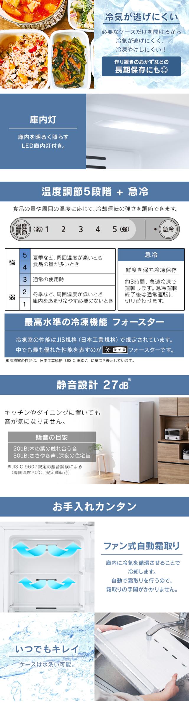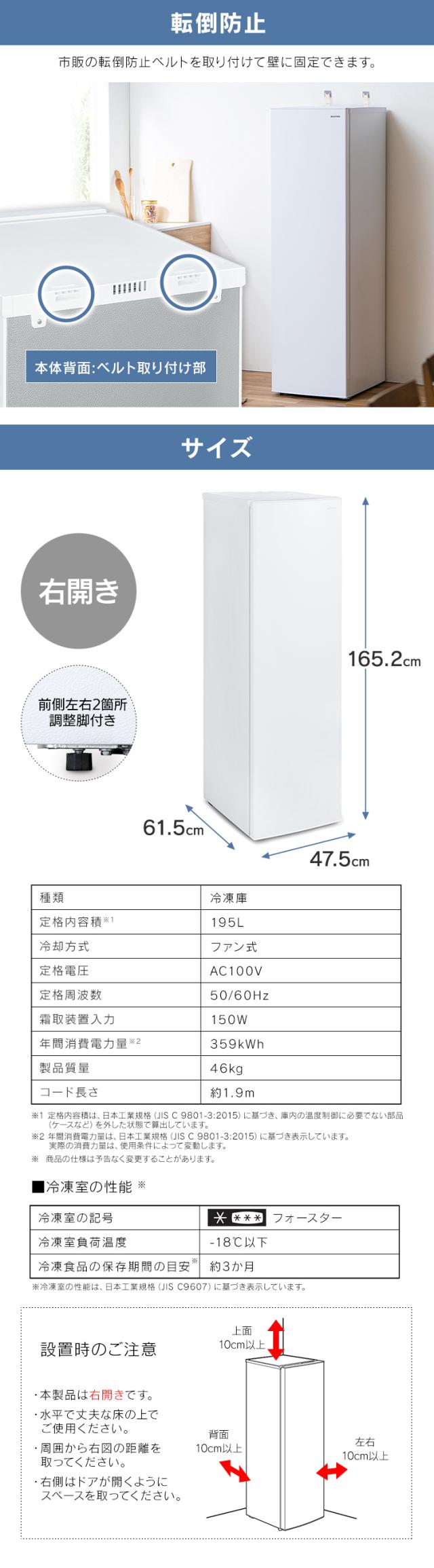 ●商品サイズ(cm)/質量:幅約47.5×奥行約61.5×高さ約165.2/約46kg●定格内容積※1:195L●冷凍室の性能※2:記号/フォースター、冷凍負荷温度(食品温度)/-18℃以下、冷凍食品の保存期間の目安/約3か月●定格電圧:AC100V●定格周波数:50/60Hz共用●霜取装置入力:150W●年間消費電力量※3:50Hz/359kWh・60Hz/359kWh●省エネ基準達成率:170%●コードの長さ:約1.9m●ドア開閉方向:右開き