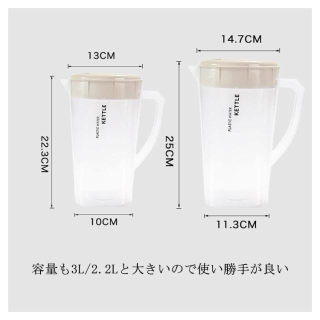 | キッチンで活躍する耐熱耐冷ピッチャー。 耐久性に優れ、清潔感のある半透明カラーで中身も見え安心して使えます。 容量も3L/2.2Lと大きいので使い勝手が良い。 広口で中も洗いやすく、お手入れ簡単です。 ホテルや飲食店等の業務用としてはもちろん、ご家庭でもおすすめです。 | |