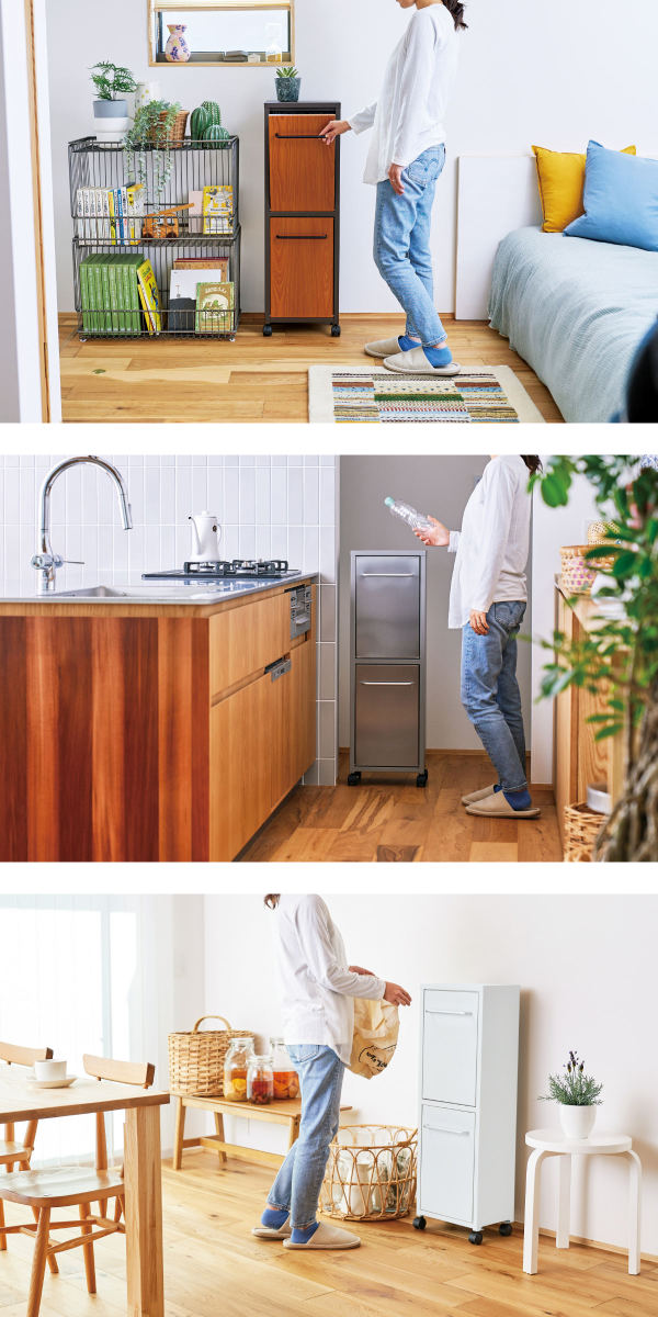 外壁にも使用されているガルバリウム銅板製で丈夫で高級感を感じる2分別ダストボックスです。上下各20Lサイズで分別用としてお使いいただけます。約幅30cmとスリムなので、キッチンやリビングの空間を有効活用できます。