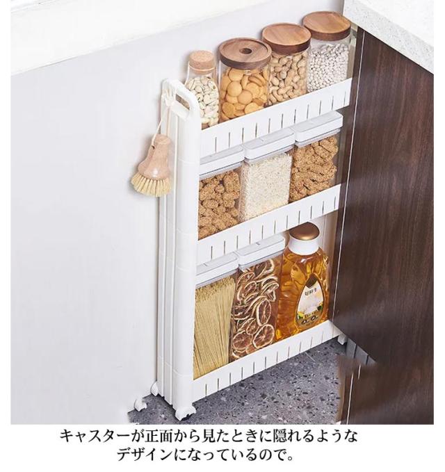| 進行方向キャスターと取手付き、 握りやすい取手付きで、たくさん収納していても楽ラク引き出せます。 頻繁に取り出すアイテムもストレスフリーで手に取れます。 キャスターが正面から見たときに隠れるようなデザインになっているので、 正面からみるとキャスターワゴンとは思えないほどのカモフラージュ効果です。 収納はできるだけ目立たないよう、バレないようにしたいもの。 | |
