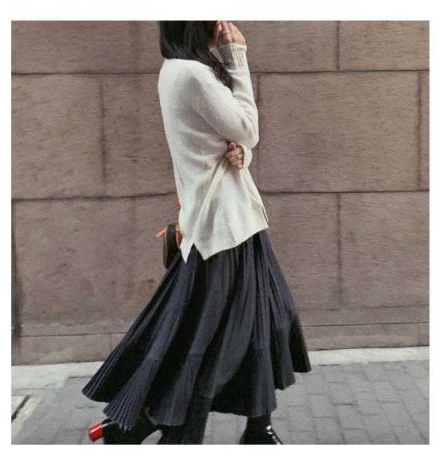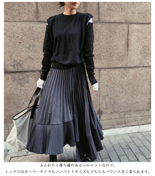 | アシンメトリーなヘムラインが特徴のプリーツスカート。 ふんわりと広がるシルエットが、フェミニンな雰囲気を漂わせます。 ウエストはゴム仕様でストレスフリーな穿き心地。 アシンメトリーなヘムが動きをプラスし、足元を軽やかに演出。 ふんわりと落ち感のあるシルエットなので、トップスはオーバーサイズもコンパクトサイズもどちらもバランス良く着られます。 ニットやスウェットを合わせた大人カジュアルなコーデがおすすめ! | |