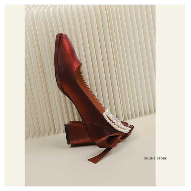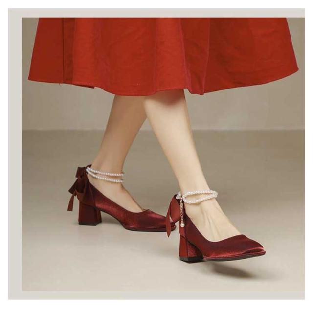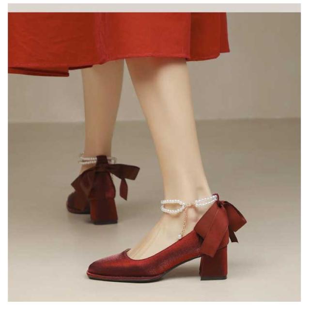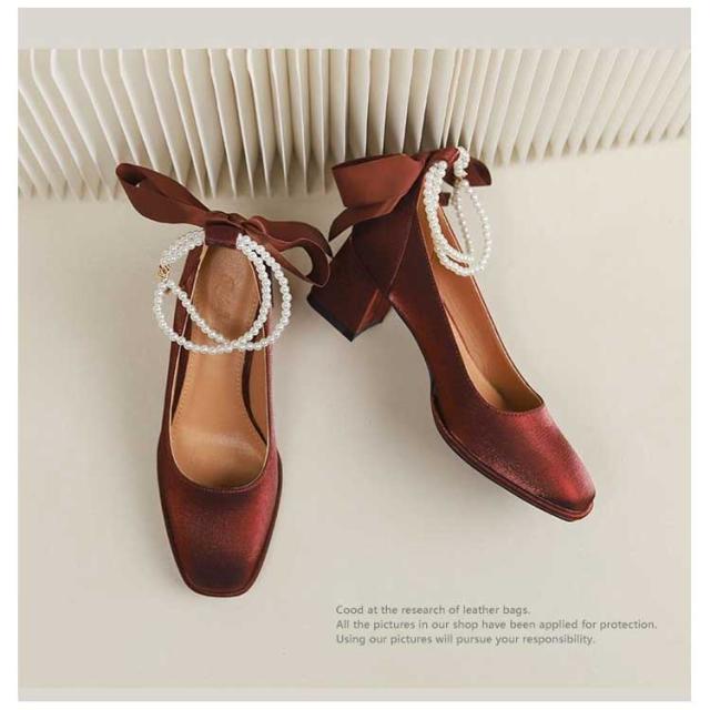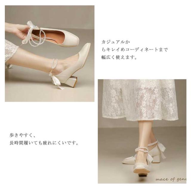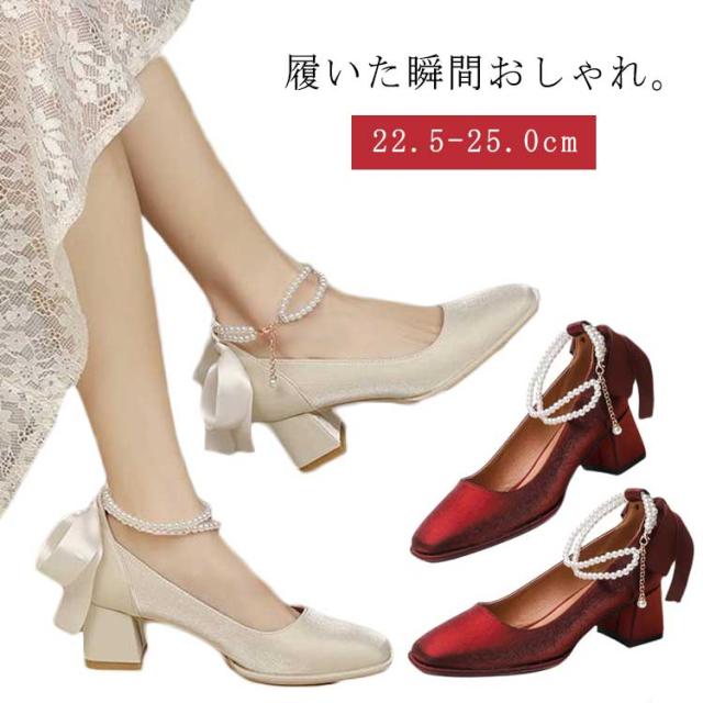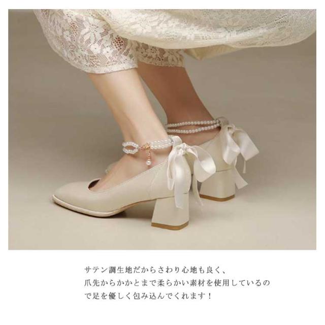 パンプス ストラップ レディース バックリボン 太ヒール ハイヒール チャンキーヒール パール スクエアトゥ 足首 美脚 太め ヒール 靴 アンクルストラップ サテン調 歩きやすい 結婚式 入学式 発表会 痛くない 22.5-25.0cm