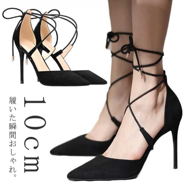 パンプス ハイヒール レースアップシューズ レースアップパンプス ピンヒール 10cm 美脚 歩きやすい ポインテッドトゥ クロスストラップ ドレス スウェード調 ブラック 靴 22.0-25.0cm